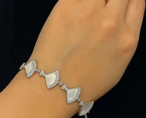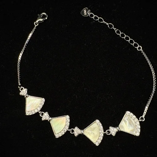 Elevate your elegance with our Celestial Fan Radiance Bracelet, a delicate fusion of timeless grace and modern design. Crafted in 925 sterling silver, this exquisite piece features a series of fan-shaped motifs inlaid with iridescent mother-of-pearl, each accented by a sparkling halo of high-quality cubic zirconia stones. The shimmering textures catch the light with every movement, creating a dazzling play of brilliance and sophistication.